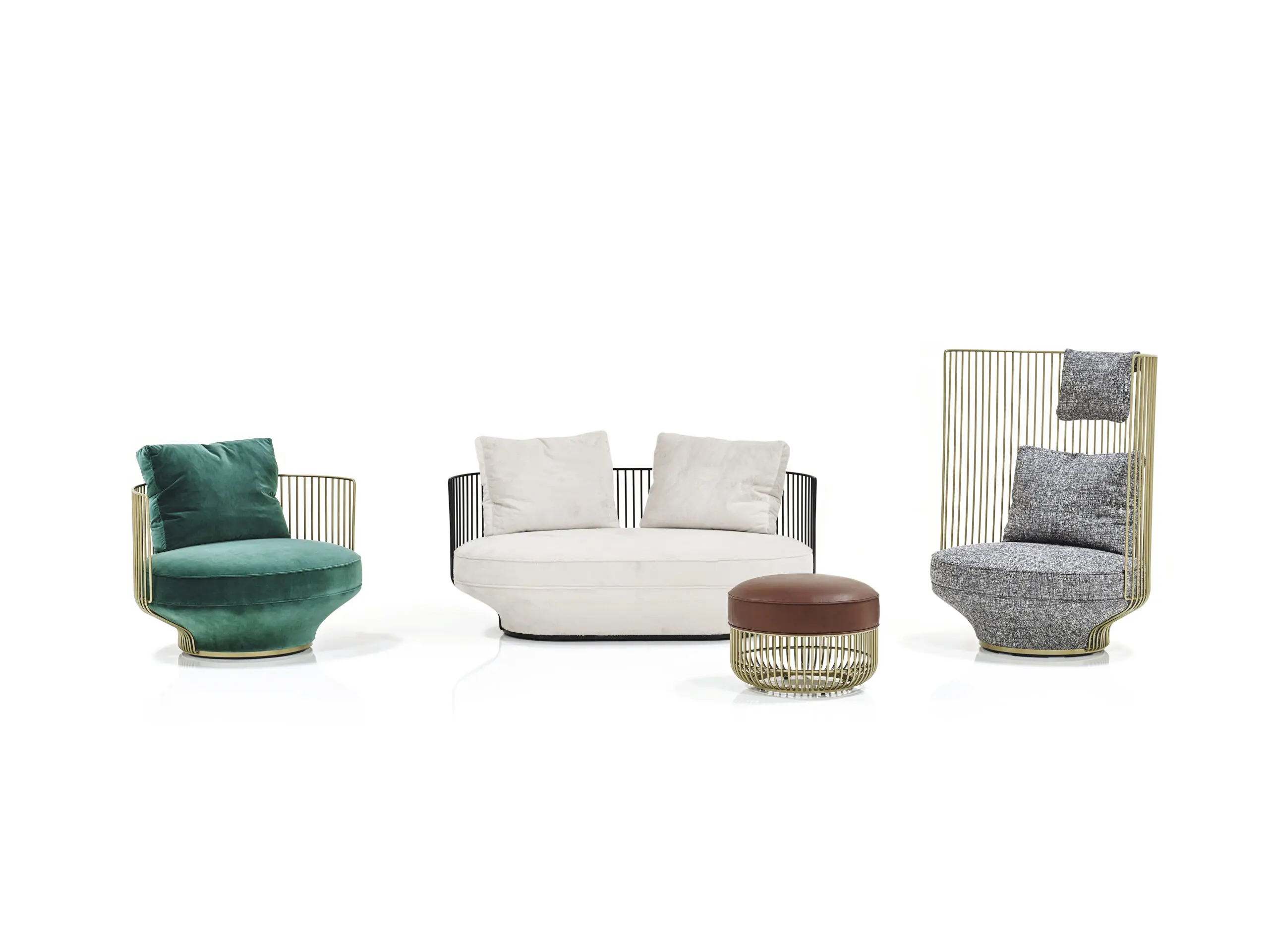Der offene, leicht nach hinten geneigte Rahmen suggeriert Leichtigkeit und Transparenz, fast wie ein Käfig für einen exotischen Vogel – daher auch der Name Paradise Bird. Zugleich lädt die großzügig gepolsterte Sitzfläche mit ihrer umarmenden Form zum Verweilen und Entspannen ein.